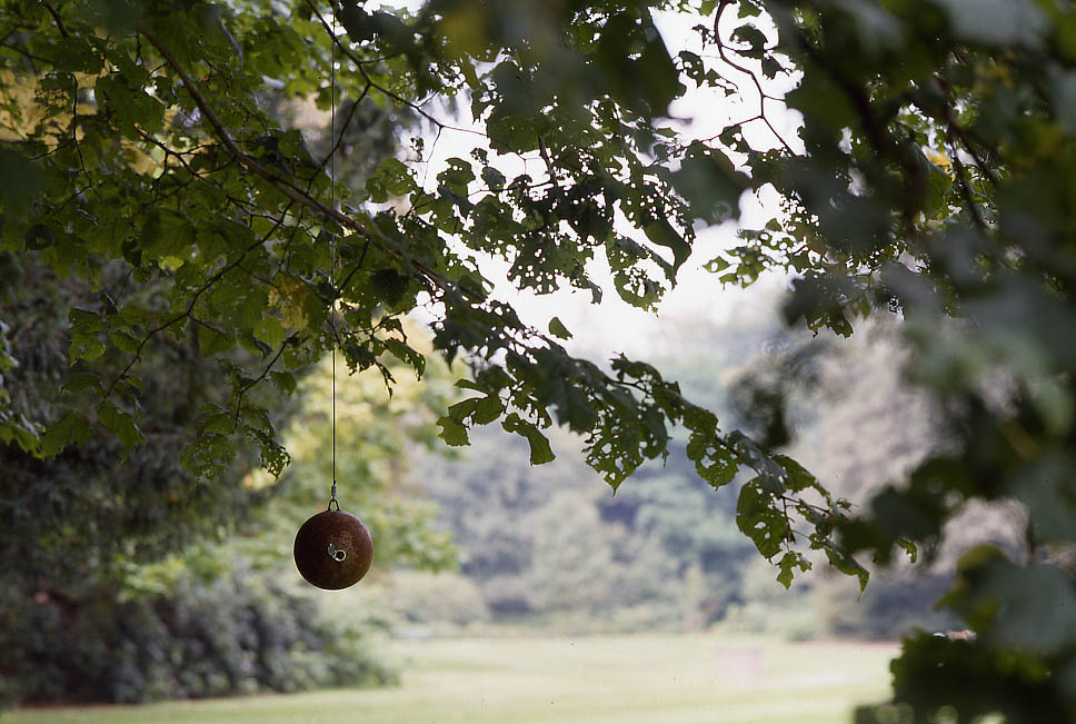 50 iron balls with lens hang to steel cables on 1,5 meters height, according to a pattern. Accompanying folder. Avegoor, Rheden, 1997 Tentoonstelling Exhibition “Between Trees and Waves” |